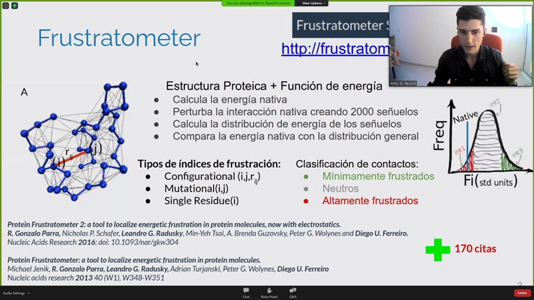 En junio de este año ganó un premio por un póster presentado en el Simposio del Consejo Estudiantil (SCS) de la Sociedad Internacional para Biología Computacional (ISCB, por sus siglas en inglés) en el cual expuso el propósito de FrustratometeR, un conjunto de herramientas desarrolladas y agrupadas en un paquete R que calcula la frustración local en proteína. “Como estudiante de cuarto año era importante participar porque te enfrentas a problemas reales y al miedo de no estar preparado o no tener las herramientas necesarias. A su vez, era mi primera participación en un congreso y tener que presentar en inglés, que no es mi fuerte, fue todo un desafío. La verdad, es una linda experiencia y se aprende un montón”. Además, quiere seguir presentando este trabajo en otros congresos y publicarlo como paper en una revista científica de proyección internacional. Después de eso, Atilio planea hacer la tesina de grado, “que seguramente arrancaré el año que viene”, aspirar a un doctorado y seguir como investigador.